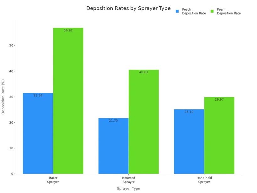 También puede obtener más gotas en los árboles ajustando la velocidad al caudal de líquido y aire adecuados. Al configurar su pulverizador de aire para huertos, verifique la velocidad con un GPS o una fórmula. Cambie el patrón de pulverización según la forma del árbol. Los patrones de pulverización de cono funcionan mejor para copas densas. Los patrones de pulverización de abanico son ideales para ramas bajas y áreas planas. Puede ajustar el patrón para árboles de diferentes alturas.
