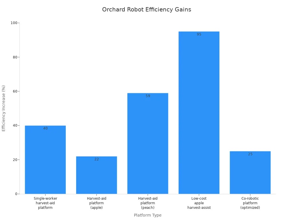 Los robots para huertos ayudan a las granjas a trabajar más rápido en la recolección de fruta. En muchos casos, estas máquinas pueden realizar trabajos con mayor rapidez que las personas. Por ejemplo, las plataformas co-robóticas recolectan manzanas entre un 11 % y un 25 % más rápido. La recolección de melocotones se incrementa un 59 % con plataformas de asistencia para la cosecha. Algunas unidades económicas de asistencia para la cosecha de manzanas casi duplican la velocidad en ramas altas. La siguiente tabla muestra el rendimiento de cada plataforma en comparación con las personas: